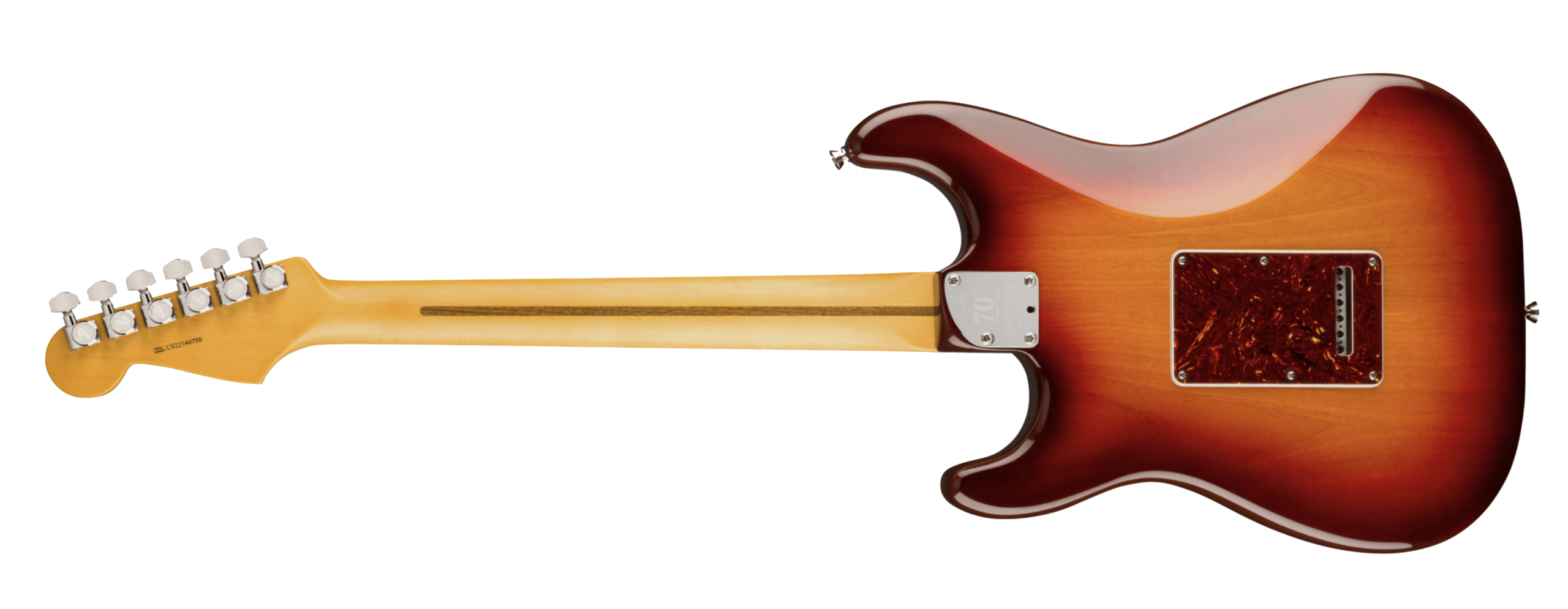 La Fender  American Pro II Stratocaster 70ème Anniversaire est équipée avec des micros spéciaux V-Mod II et d’une table en érable flammé. Cela la distingue des American Pro standard.